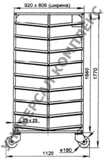 Грузоподъемность, кг: 260; Емкость вагонетки, лотки: 18; Размеры лотков, мм: 740х450; Габаритные размеры, мм: 806х920х1770; Масса без лотков, кг: 55.